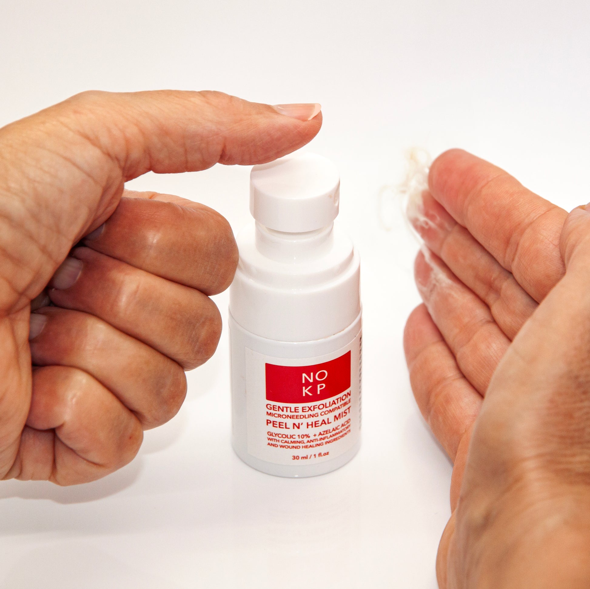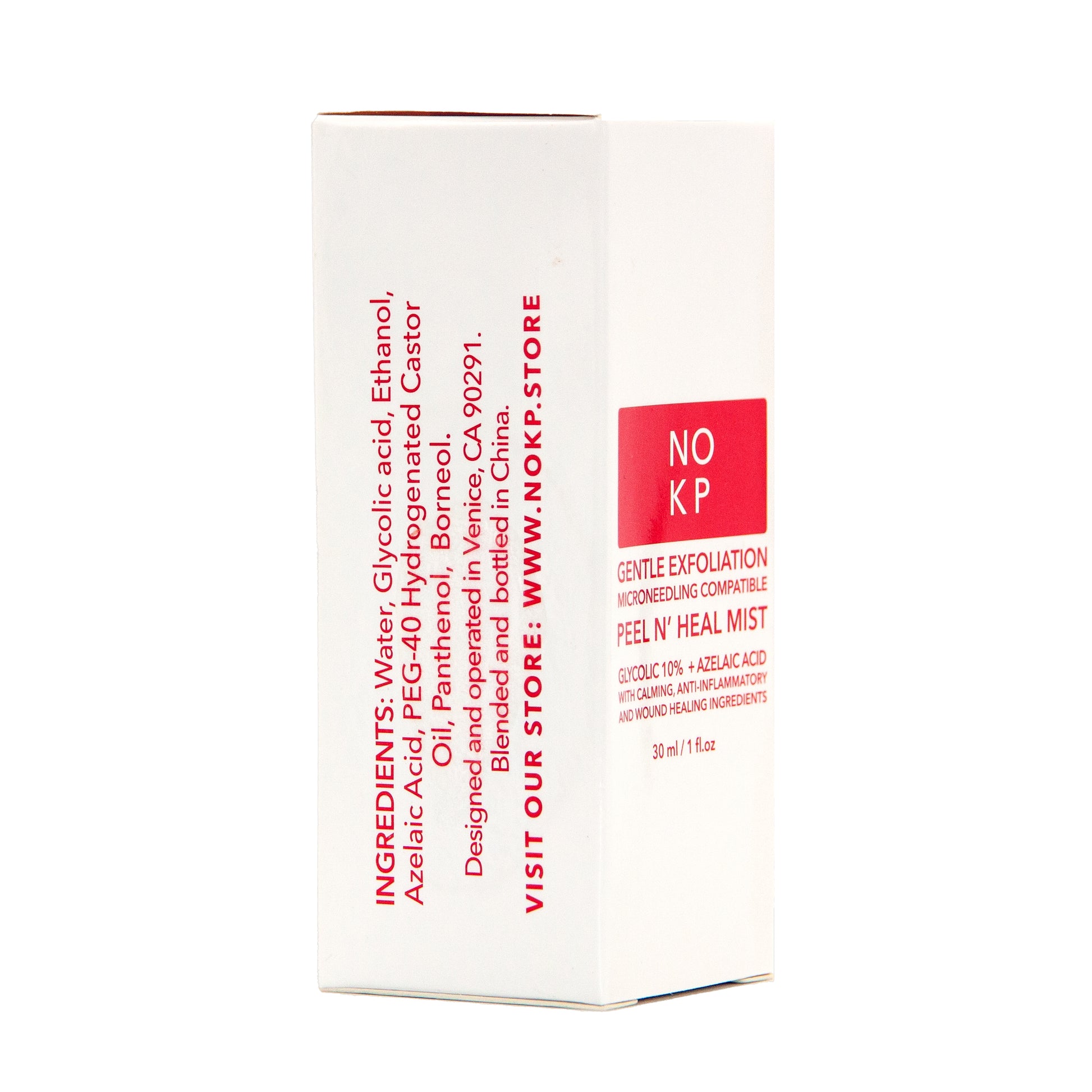 Smooth away red bumps and achieve silky, even skin with NO KP's Gentle Exfoliation Peel N' Heal Mist. This formula contains 10% Glycolic acid and Azelaic acid, making it compatible with microneedling. It gently exfoliates and unclogs hair follicles, reducing the appearance of keratosis pilaris. The mist is infused with calming and anti-inflammatory ingredients to soothe irritation and promote wound healing, leaving your skin revitalized and radiant. This 1 fl oz mist is perfect for use after derma roller application as step 2 in treatment against keratosis pilaris or as a serum before your lotion. Say goodbye to rough, bumpy skin and embrace a flawless, velvety complexion with NO KP's Peel N' Heal Mist.